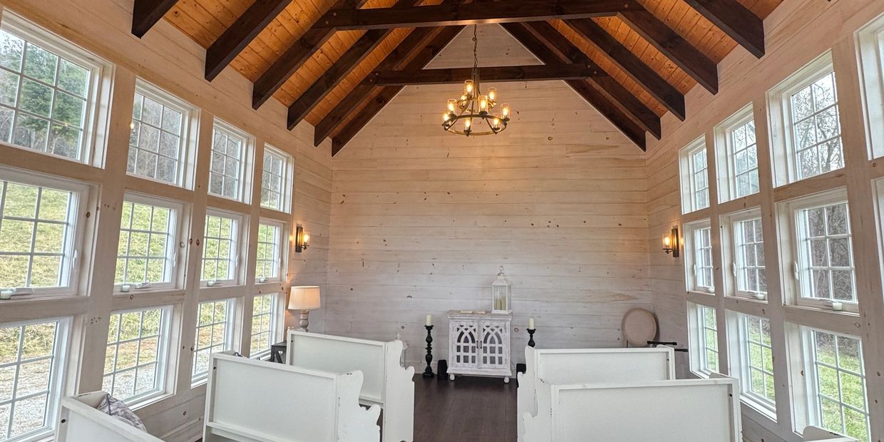 Our chapel boasts elegant decor and breathtaking views, making it the perfect backdrop for your wedding ceremony or photos with Mountain Views of the Smokies, Views of Lake Douglas, and the natural beauty of our property with 80 acres of rolling hills!